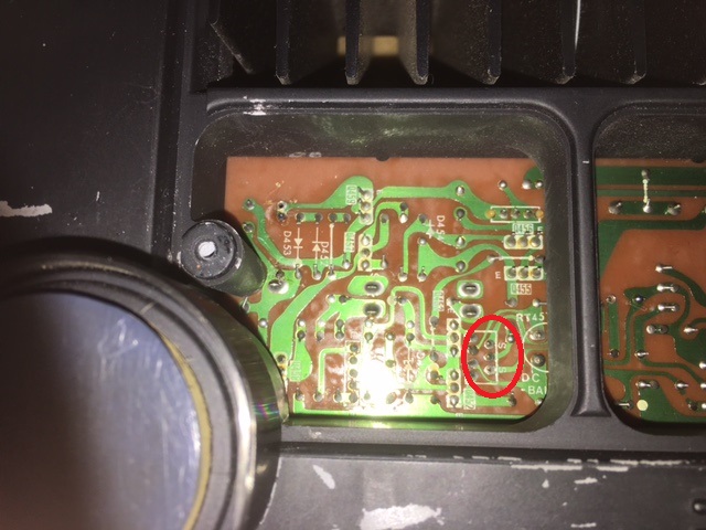 基板を見ていると、トランジスタのハンダがクラック入っていましたので修正(下の写真 赤○部分)