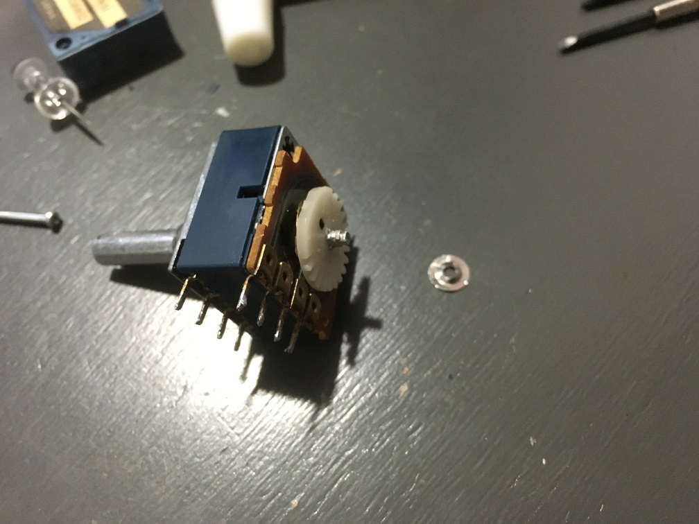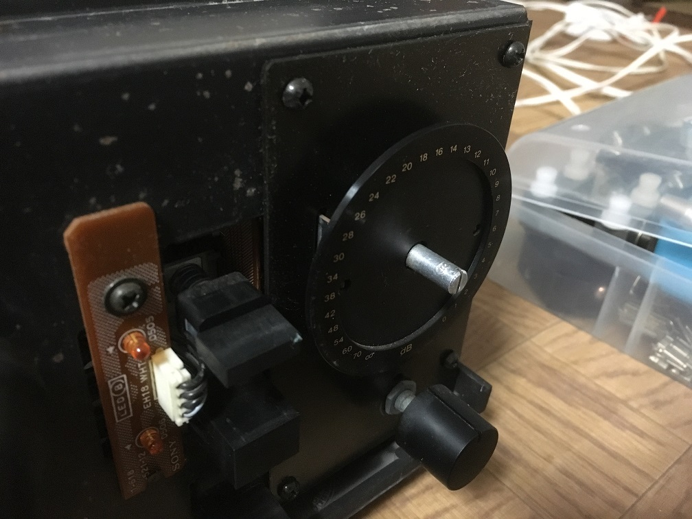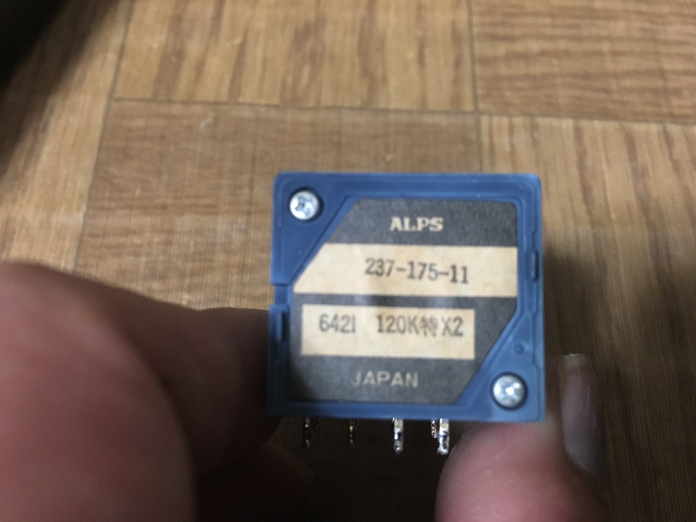 ボリュームはアルプス電子製の2連で、ラウドネス回路用の4端子目「センタータップ」付きのようです。特注品っぽい「特」の文字が見えます。