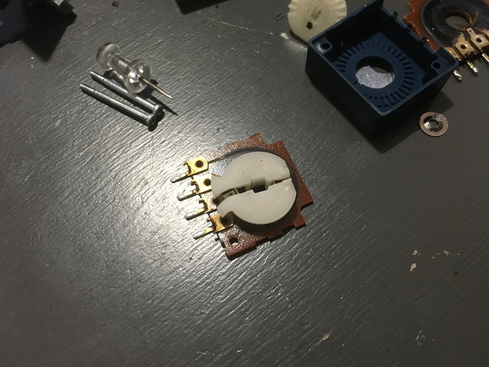 ボリュームがぐるぐる回るのは、ストッパー付の回転体が割れている事が原因と判明しましたが、こんな力の掛かる場所は、普通の接着剤ではすぐに割れてしまいそうです。