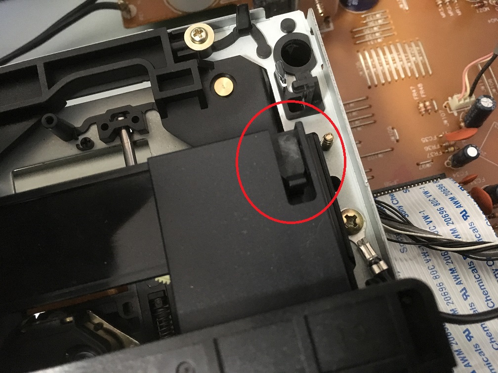 トレイ式のCDメカは、CD挿入後にピックアップ部が下から上がってきてCDを押さえる構造になっている事が多いのですが、この個体はピックアップ部分が下がったままです。