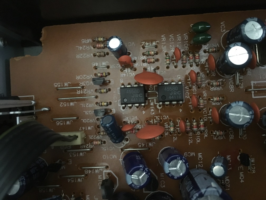 おそらくアンプ回路的には、動く程度に修理できたかと思いますが、ボリュームを何とかしないと、実用できません。
